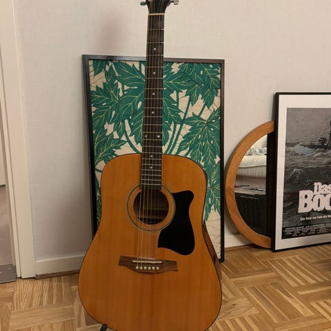 Akustisk gitarr i trä med naturfärgad finish. Gitarren har sex strängar ( Alla strängar finns ) och en traditionell design med slitsat huvud och stämskruvar på sidan. Passar för allmän musikframföring och övning. den är 100cm lång.