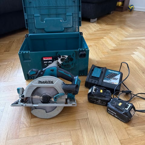 Makita DUM604Z snöslunga med en arbetsbredd på 46 cm, justerbar styrplatta för riktning av snöskottning. Utrustad med två batterier för trådlös användning. Färg blå.