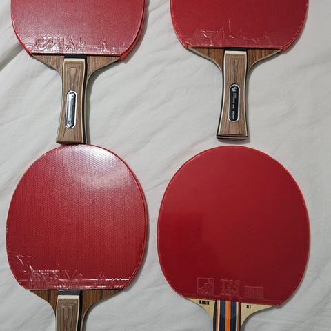 Stiga bordtennisracket med svart och röd gummiyta. Racketen är avsedd för bordtennis och har ett trähandtag med blå och naturliga träfärger. 7 stjärnit