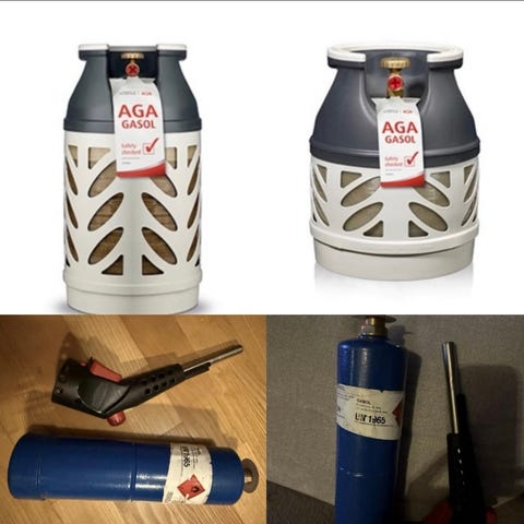 Gasolflaska med kapacitet på 11 kg, i grå färg. Används för lagring och transport av gasol full