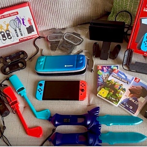 Nintendo Switch konsol med Joy-Con-kontroller, laddningsstation, ringformad träningskontroll, Mario Kart ratt och pedaler. Inkluderar flera spel: Mario Kart, Metroid, Super Mario Maker 2, Super Mario Odyssey och andra.