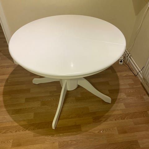Runt matbord, vitmålat underrede.