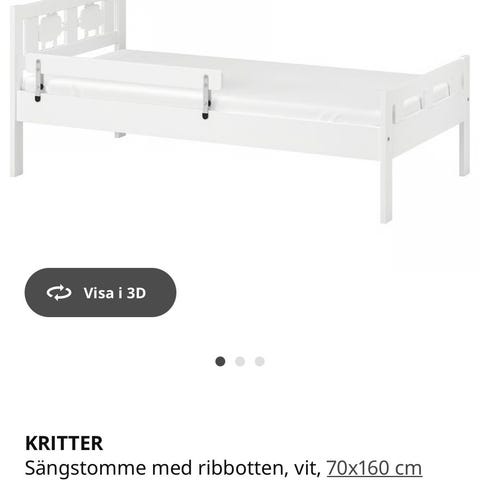 IKEA Kritter juniorsäng med ribbotten i vit färg. Sängen har måtten 70x160 cm och är avsedd för barn. Den är tillverkad i trämaterial och har en enkel design anpassad för barnrum.