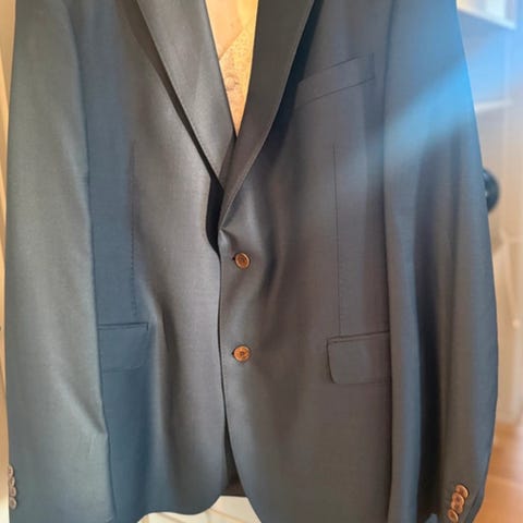 Elegant kostym med en mörk vit kavaj och svarta byxor. Kavajen har en ficka på bröstet och en