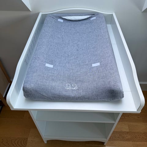 Därtill ett sött ljusblått/ljusgrått skötbädd från Done by Deer med Raffi motiv. vattenavvisande överdrag så att det är enkelt att hålla rent. Mått: 50 x 65 x 10 cm. Se bild för fler detaljer.