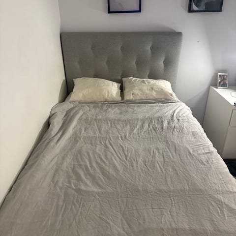 Säng i mycket bra skick. Stabil stålram med resorkärna som är fast i fjädringen, på den en 7cm tjock bäddmadrass med memoryskum. Madrasskydd är alltid använt så sängen är i mycket fint skick. Madrasserna är 105x200 cm ink sängram är måtten 110x210 cm