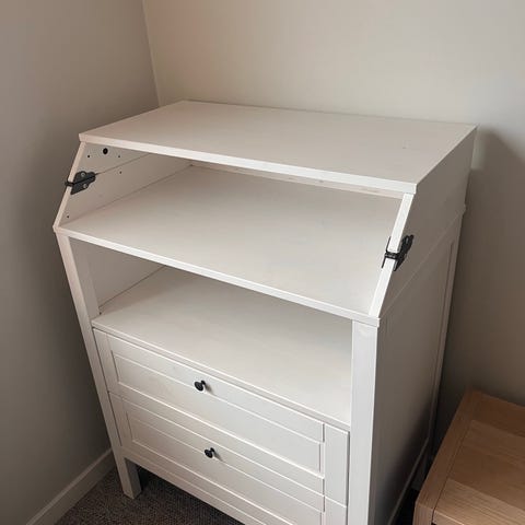 Ett skötbord med egen prägling, målad i en beige kulör (Fårö från Alcro) och knoppar i guld.