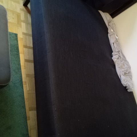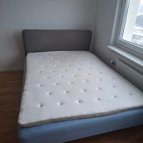140 cm IKEA säng (rammadrass) med träben. Fjädringen har mjuknat något i mitten av sängen. Men funkar!