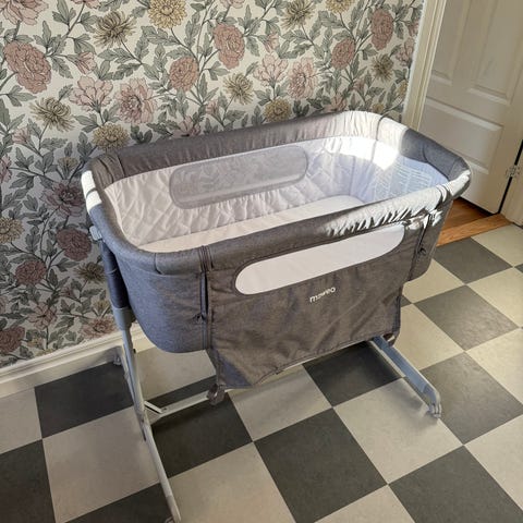 Moweo Bedside Crib i grått. Säng med vadderad bäddmadrass och förvaringsväska. Har avtagbar sida och fem justerbara höjder från golv till överkant av spjälsängens huvuddel (72–88 cm). Fem justerbara höjder till underkant av spjälsängens kropp (41–50,5 cm). Avstånd mellan golv och spjälsängens botten i lägsta läge är 41 cm. Avstånd mellan golv och spjälsängens botten i högsta läge är 53 cm. Basbredd är 64-62 cm, höjd sängkorg är 53 cm och bredd sängkorg är 45 cm. Längd sängkorg är 152 cm. Hjul med broms och enkel att flytta med sig.
