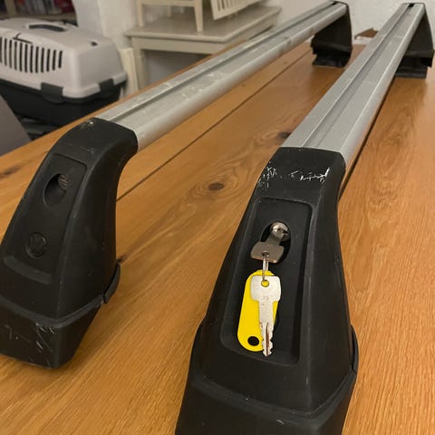 Takräcke i aluminium för Volkswagen Golf i bra skick. Passar säkert andra modeller med samma bredd, men har använts på senaste modellen av Golf Sportcombi av mig.