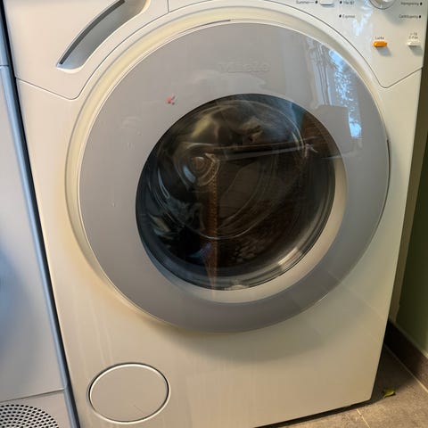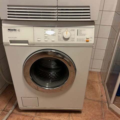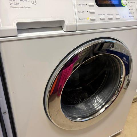 Miele frontmatad tvättmaskin. Maskinen har en rostfri trumma och är designad för att placeras fristående eller under bänk.