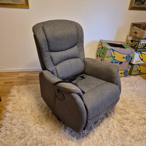 En mkt bekväm fällbar (manuellt) fåtölj med fotpall. Mörkgrå