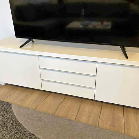 TV-bänk: 3 fack, 2 meter bred med en glasdörr med handtag samt glasdetalj ovanpå. Pris: 2000 kr