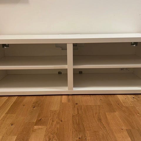 TV-bänk i vitt med flera öppna hyllor för förvaring.