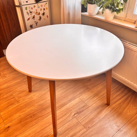 Ilva rund matbord med vit bordsskiva och träben. Passar för olika matrumsinredningar och kan användas för måltider och sociala sammankomster.