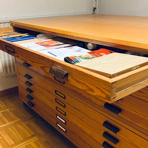 Sektion med ritning - och arkivskåp/hurts från mitten av 1900-talet tillverkade i furu. Skåpen har stabil konstruktion och flera plana lådor anpassade för ritningar, kartor eller större pappersformat upp till A1.