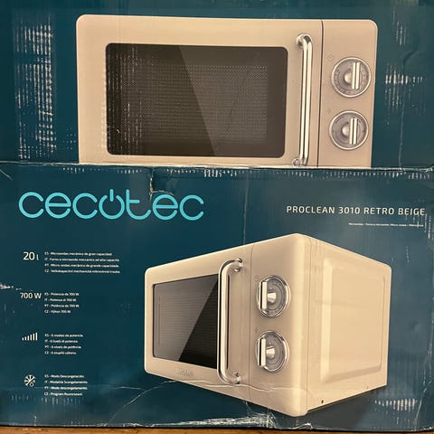 Härlig retrostil. Den ser vit ut på mina bilder (hade svårt att få till ljuset) men den är beige i färgen. För att se färgen bättre, och få ännu mer detaljerad info, kolla länken nedan. Den funkar perfekt, säljer den bara för att micro var inbyggt i köket i det nya huset vi köpte.