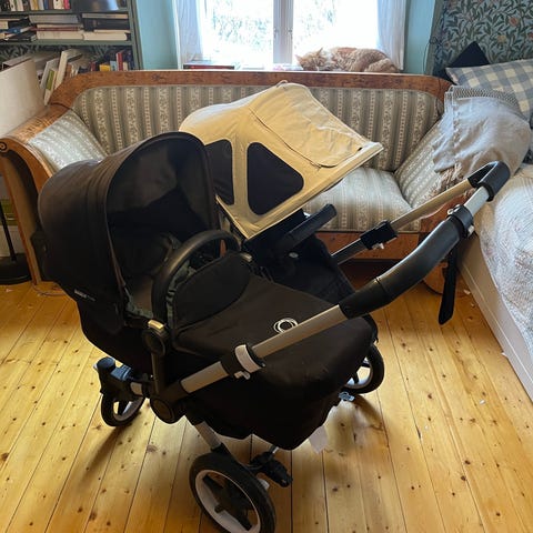 Bugaboo donkey duo barnvagn i svart färg, inköpt 2022. Vagnen är utformad för två barn och inkluderar flera tillbehör och olika sittdynor i olika färger. Köper inkluderar en liten skötvsäska samt mugghållare och en adapter för Britax Römer bilbarnstol. Passar för barn och har en robust konstruktion för vardagligt bruk.
