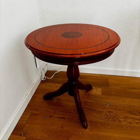 Ca 76 cm högt, skivan är ca 48 cm i diameter.