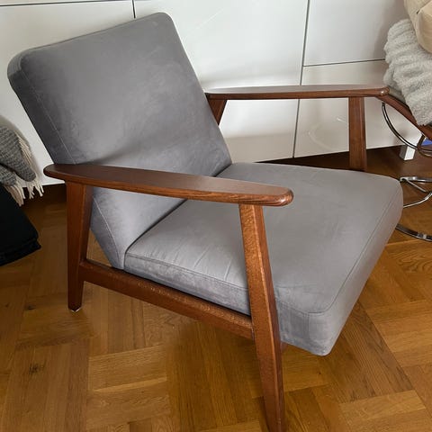 Två fåtöljer, Ekenäset. Grått tyg. Betsat brunt trä. Finns ej att köpa i butik längre.