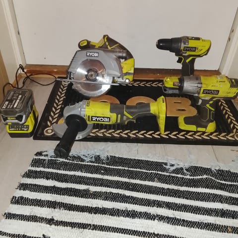 Ryobi verktygspaket som innehåller en borrmaskin, slagborrmaskin, vinkelslip och tigersåg. Syns att de använts men alla fungerar fint. Passar för olika typer av bygg- och reparationsarbeten. Endast verktyg.