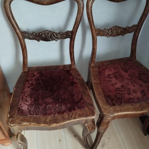 4 röda stoppade skinnstolar i mycket fint skick. Benen är av björk.