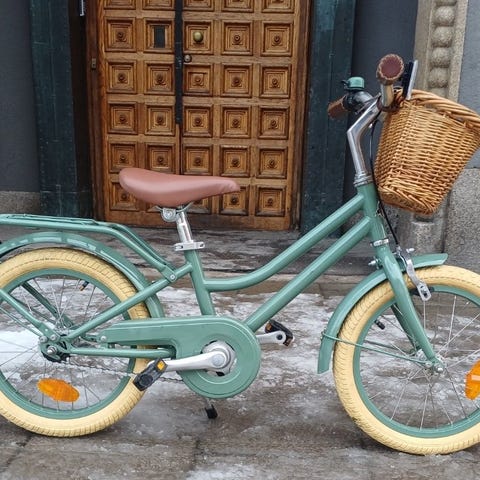 DBS barncykel i lila färg med 16 tum hjulstorlek. Cykeln är designad för barn och har en ram i metall. Utrustad med stödben och pakethållare. Fint skick, liten buckla på stänkskärm bak (se bild) och lite skev cykelkorg, men annars helt fint skick.