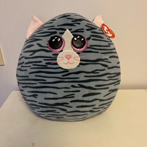 Ty gosedjur i form av en katt med stora ögon och mjukt tyg.