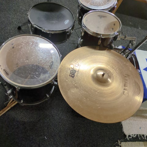 Sonor Force 2001 Trumset i svart färg. Består av flera trummor och cymbaler monterade på stativ. Passar för musikframträdanden och övning.