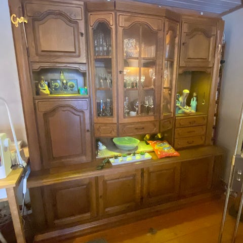 Skåpet har två vitrindelar med blyinfattat glas, öppna hyllor och gott om förvaring i både skåp och lådor.