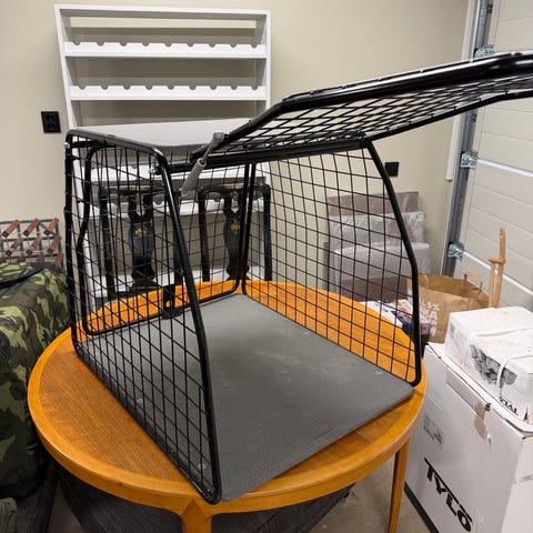 ArtFex hundbur för bil i svart metall. Burens konstruktion består av ett metallnät med en fast bottenplatta. Två nycklar finns. Har använts av en golden retriever tik. Designad för att användas i bil för säker transport av hundar.
