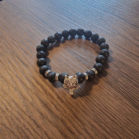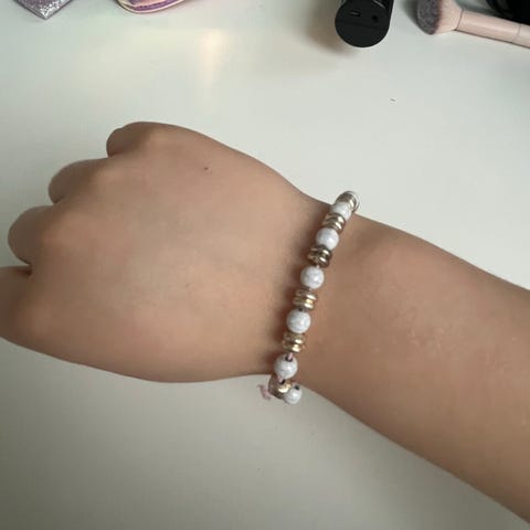 Elastiskt armband med färgade pärlor och detaljer i guld. 17,4 omfång.