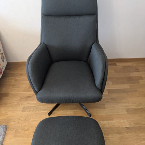 Skön fåtölj med fotpall säljes. Från Jysk. Mörkgrå. Varsamt använd. Fint skick.