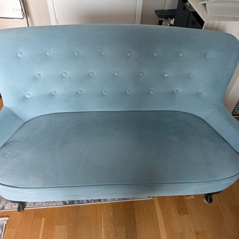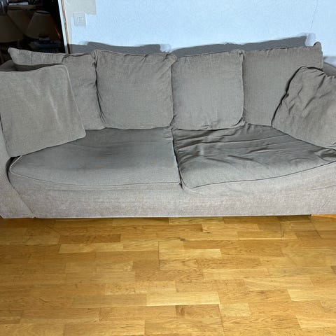 Sofforna har några år på nacken men är fortfarande i gott skick. Sittkuddarna är löstagbara, vändbara tyget kan tas av och tvättas.