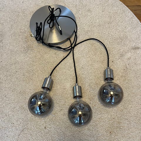 Taklampa med tre hängande lamphållare. Det går att justera längden på lamphållarna individuellt. Fint skick!