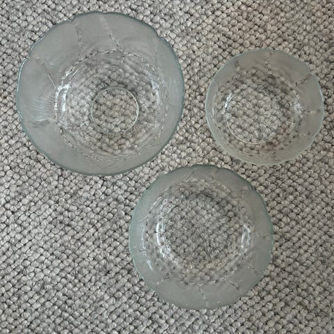 Ett set om tre vackra, klara glasstallrikar/fat från Arcoroc, med detaljerat Aspen-bladmönster. Perfekta för servering eller som dekorativa föremål. Tre olika storlekar ingår i paketet.