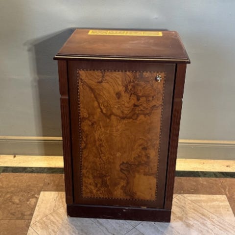Skåp från tidigt 1900-tal. Endast 160 cm högt och fint inrett. Grunden är ek.