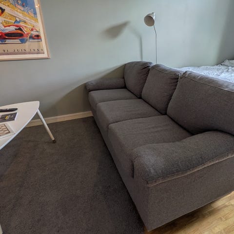 3-sitssoffa i grått tyg från IKEA i mycket bra skick. Säljes ihop med en passande fotpall, stor nog att användas som extra sittplats.