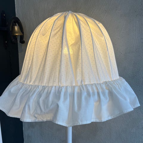Fin golvlampa som sprider varmt rosa sken, ca 165 cm hög. Finns ett streck ritat med tusch på skärmen, se bild, men bara att snurra på skärmen så det inte syns.