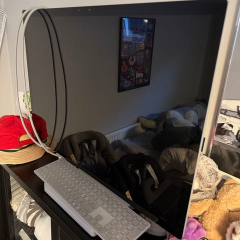 Microsoft Surface Laptop Studio med 14,4 tum skärm i färgen Platinum. Utrustad med 11:e generationens Intel Core i7-processor, 32 GB RAM, 2 TB lagring och NVIDIA GeForce RTX 3050 Ti GPU.