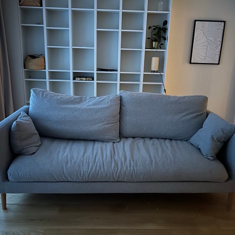 Ikeas soffa Stockholm. Tre-sits, men två dynor. En riktigt bra soffa, men den har varit med ett tag och har fläckar. Tyget går att ta av och tvätta.