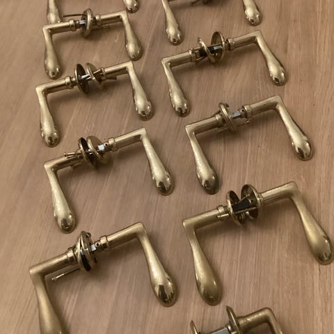 9st dörrhandtag i mässing med nyckelskylt i klassisk design. Handtagen är tillverkade i mässing och passar för dörrar med lås. Inkluderar flera uppsättningar handtag och nyckelskyltar. En del repor men kan och åldersrelaterat slitage men kan putsas upp för blankare finish. Vet ej vilket år de är från men satt i 30-talshus.