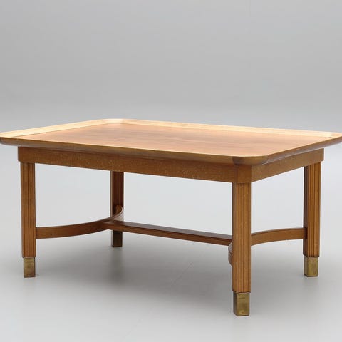 Soffbord i trä med snidade ben och en rektangulär bordsskiva. Bordet har en klassisk design med böjda ben och en kantad bordsskiva. Färgen är träfärgad med en naturlig finish. 135 cm långt, 75 cm brett och 56 cm högt.