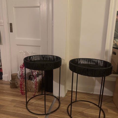Sängbord med svart stålställning. Marmormönstrade skivor i glas.