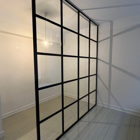 Svart glasvägg med svart metallram. Väggens design består av flera glasrutor infattade i en svart metallram, vilket ger en modern och industriell känsla. Passar för att avgränsa rum samtidigt som ljus släpps igenom.