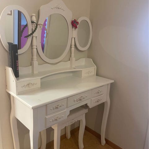 Sminkbord bredd 100cm djup 36cm höjd 74cm. Ena lampan /ljuskälla trasig. Inget fel på armaturen.