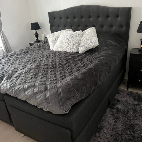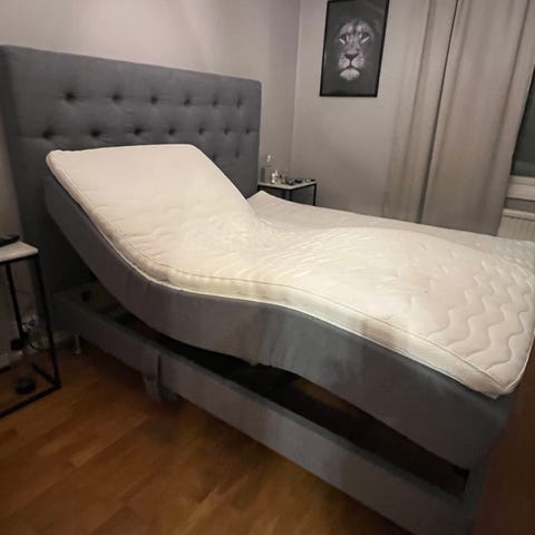 Mio justerbar säng med grått tyg och fjärrkontroll