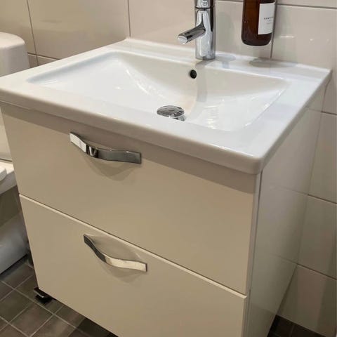 Vedum tvättställsskåp med handfat i vit färg och Gustavberg blandare. Skåpet har två lådor med handtag i metall och en integrerad blandare i krom. Skåpet är utrustat med förvaringsutrymme inklusive en utdragbar låda och en avdelare för organiserad förvaring. Passar för badrum och erbjuder funktionell förvaring under handfatet.