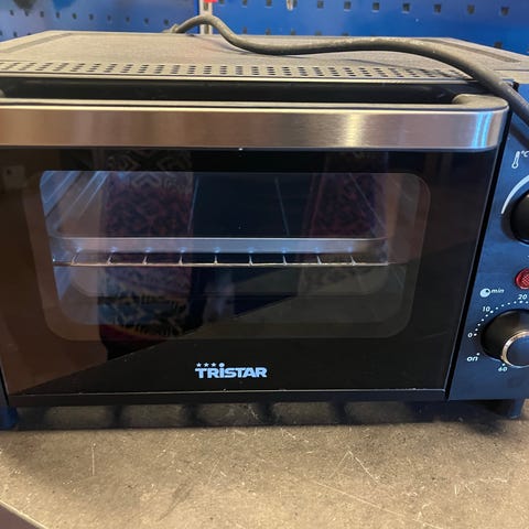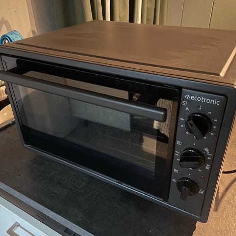 Ugnsutrustad med rattar för inställning av temperatur, timer och funktion. Passar för mindre utrymmen och enklare matlagning.
