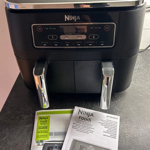 Ninja Foodi Airfryer i svart färg. Utrustad med digital kontrollpanel och två korgar för matlagning. Passar för tillagning av olika rätter med varmluftsteknik. Inkluderar användarmanual och receptguide. Ingen box, använd i ett år